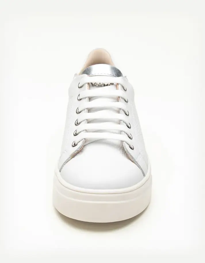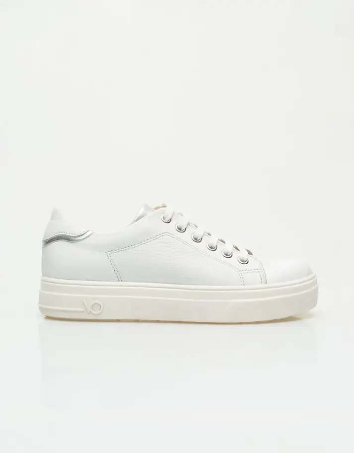 Zapatilla de cuero vacuno graneado y aplique metálico. Minimalismo que marca estilo. Esta zapatilla urbana está confeccionada en cuero vacuno, con base de goma que eleva tu look con comodidad. Incluye detalles de ojalillos metálicos, cordones clásicos y un aplique metálico con la palabra Viamo en la lengüeta, que suma distinción sutil. Horma estándar que se adapta a tu ritmo diario. Un modelo ideal para completar outfits monocromos, sumar altura sin resignar confort o renovar tu fondo de armario con un básico con carácter.
